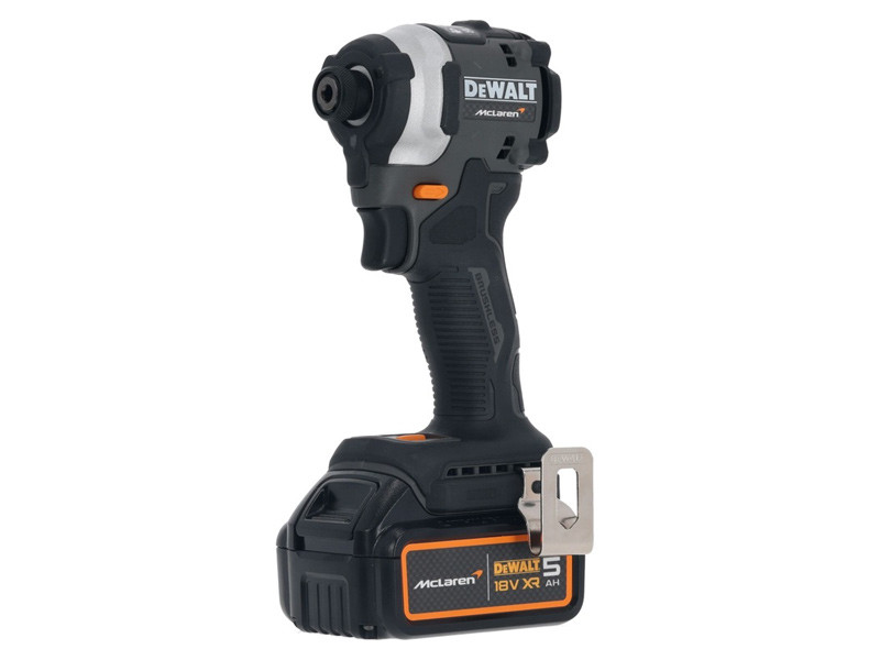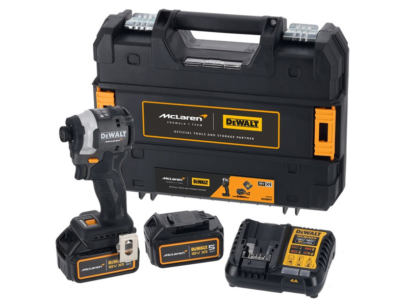 - A készlet tartalma: DCF85M DEWALT × McLaren 18V XR kompakt ütvecsavarozó, 2 × 5 Ah akkumulátor, DCB1104 4 A töltő, TSTAK kompatibilis dobozban